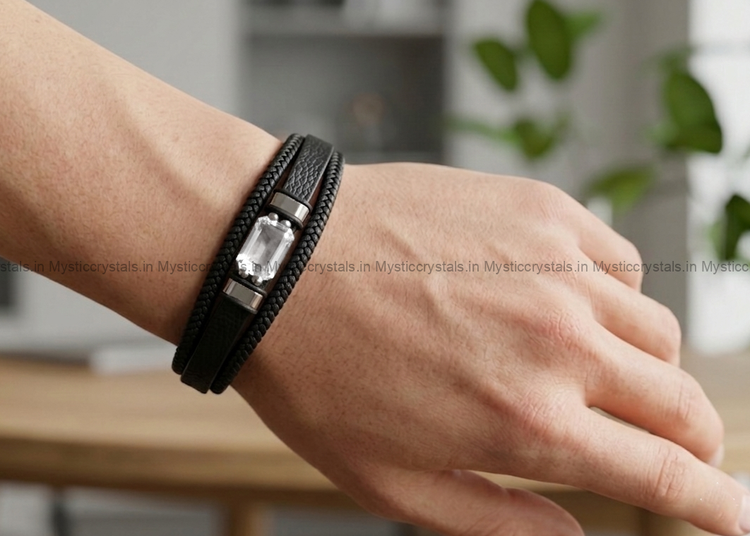 This Clear Quartz Leather Strap Bracelet is a perfect combination of modern design and powerful crystal energy. Crafted with premium black leather straps and a polished clear quartz centerpiece, this bracelet enhances both your style and positive energy.
