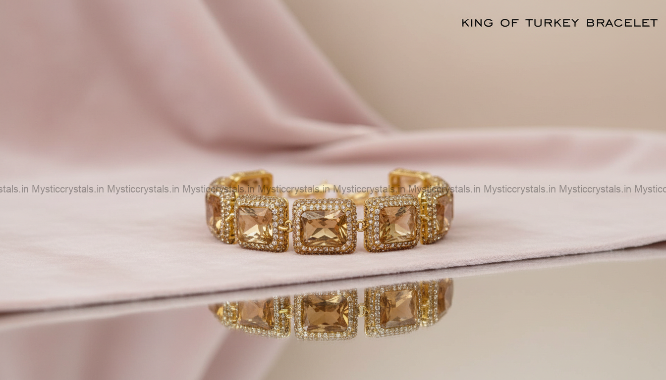 Bring confidence and positivity with this King of Turkey Stone Adjustable bracelet. This Bracelet features a golden-brown stone that shines brightly and gives a royal look. The stone is surrounded by tiny sparkling crystals, making it a perfect piece. It helps release emotional stress and boosts clarity. Attracts good luck, success, and positive energy.